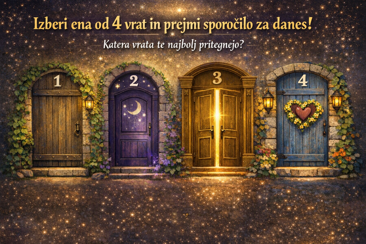 Predstavljaj si, da stojiš pred štirimi čudovitimi vrati. Vsaka vrata skrivajo posebno sporočilo ali lekcijo — izbira je tvoja intuicija. Ne razmišljaj preveč, izberi tista vrata, ki te najbolj pritegnejo!
